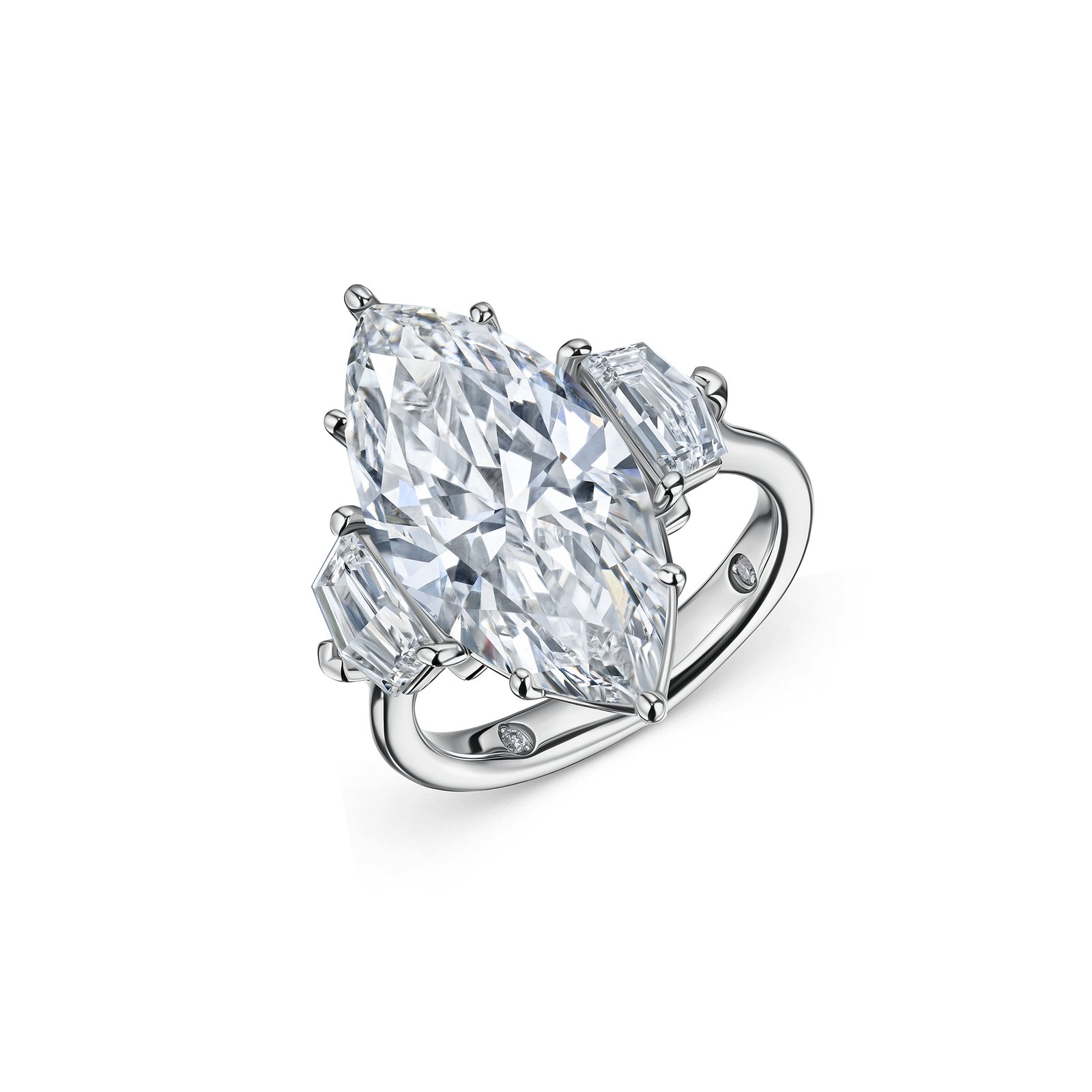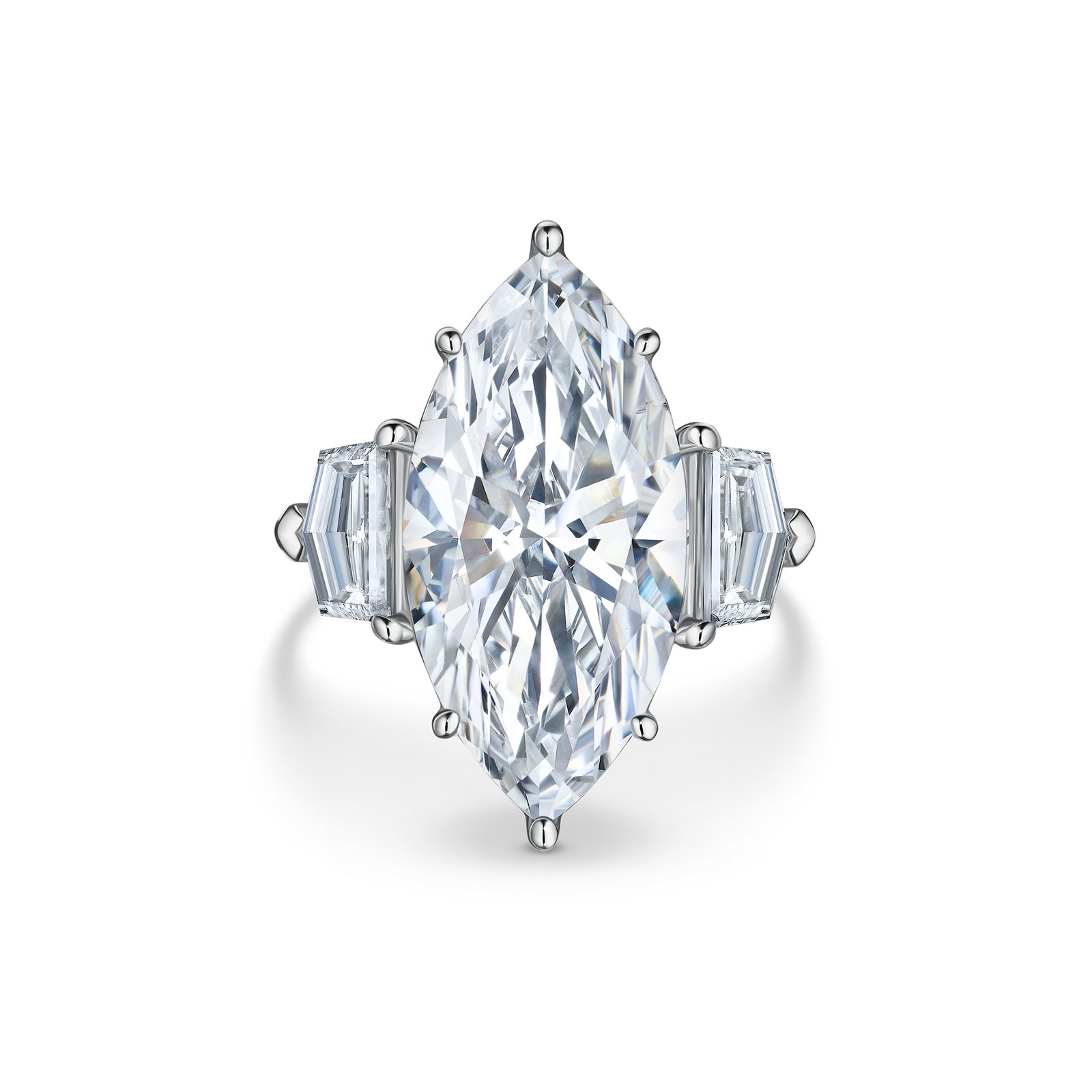 A dramatic 10.33 carats marquise lab-grown diamond, shimmering in rare E color and VS2 clarity, stretches across the finger like a comet frozen in time. Set in lustrous platinum and flanked by two perfectly calibrated side stones, it’s geometry and lustre in refined harmony. This three‑stone masterpiece isn’t merely jewelry – it’s light, shape, and permanence, distilled into wearable brilliance.