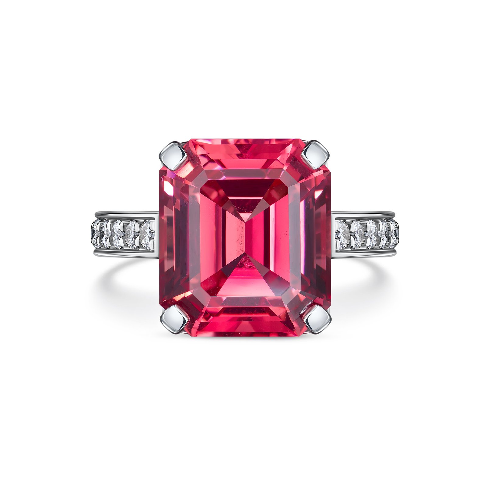 A striking design featuring emerald cut lab-grown padparadscha sapphire, radiating vibrant color and fire. Accented with sparkling lab-grown diamonds along the platinum setting, the craftsmanship enhances brilliance and detail. A distinctive creation that celebrates modern luxury