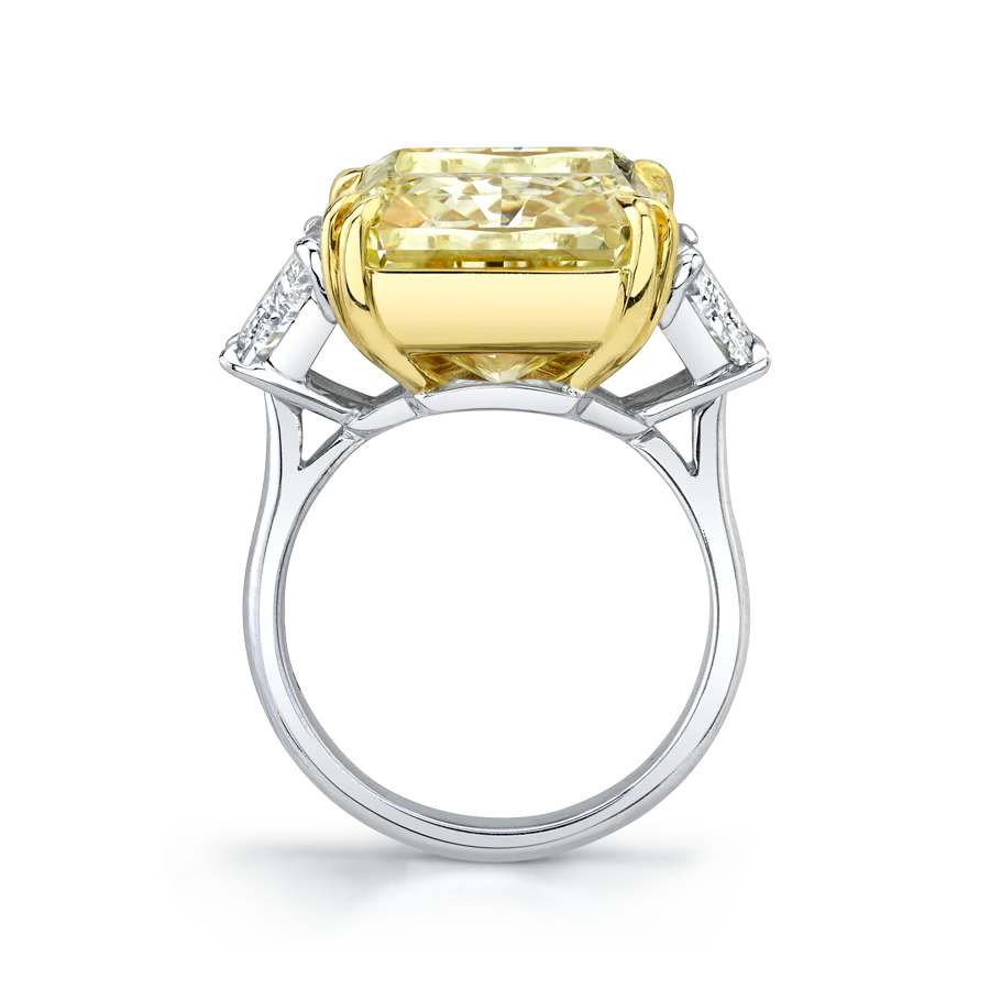 A breathtaking 18.88 carats radiant cut lab-grown diamond in Fancy Intense Yellow commands attention, its vivid hue glowing like captured sunlight. Trapezoid side stones totaling 2.24 carats flank its brilliance, creating an architectural balance that amplifies its presence. Set in platinum, this three-stone ring embodies rare color, refined form, and timeless luxury.