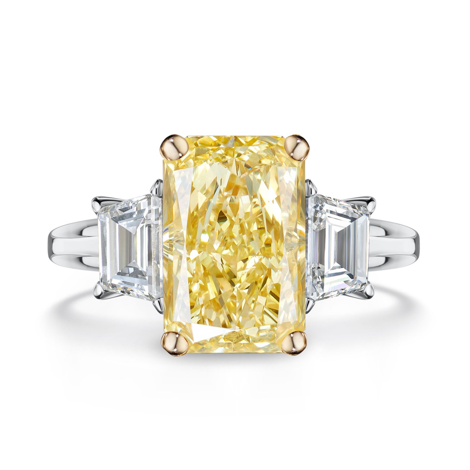 5 Carats Radiant Fancy Vivid Yellow Diamond Ring featuring a stunning radiant cut lab-grown diamond complemented by trapezoid side stones. Set in a luxurious platinum and 18k yellow gold mounting.