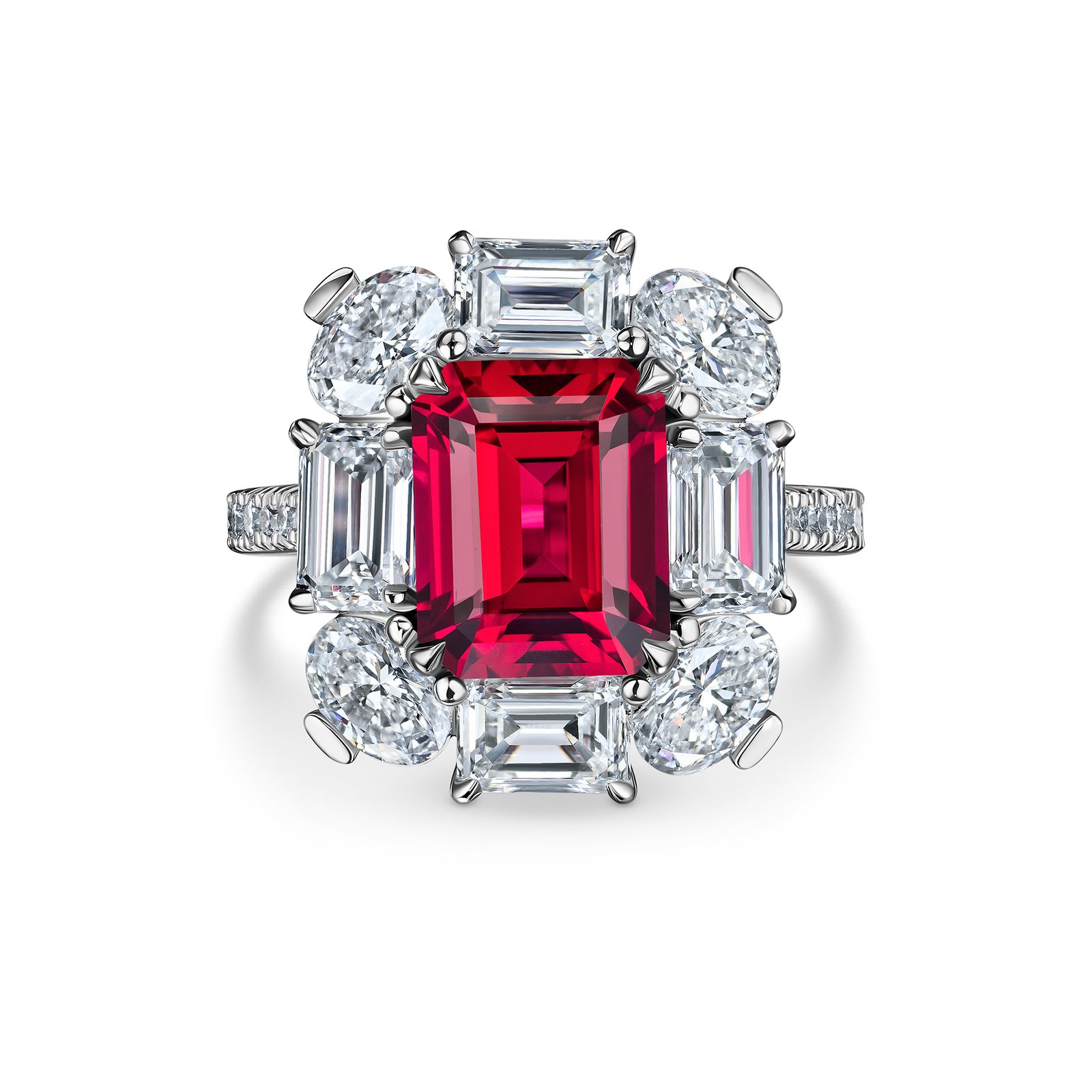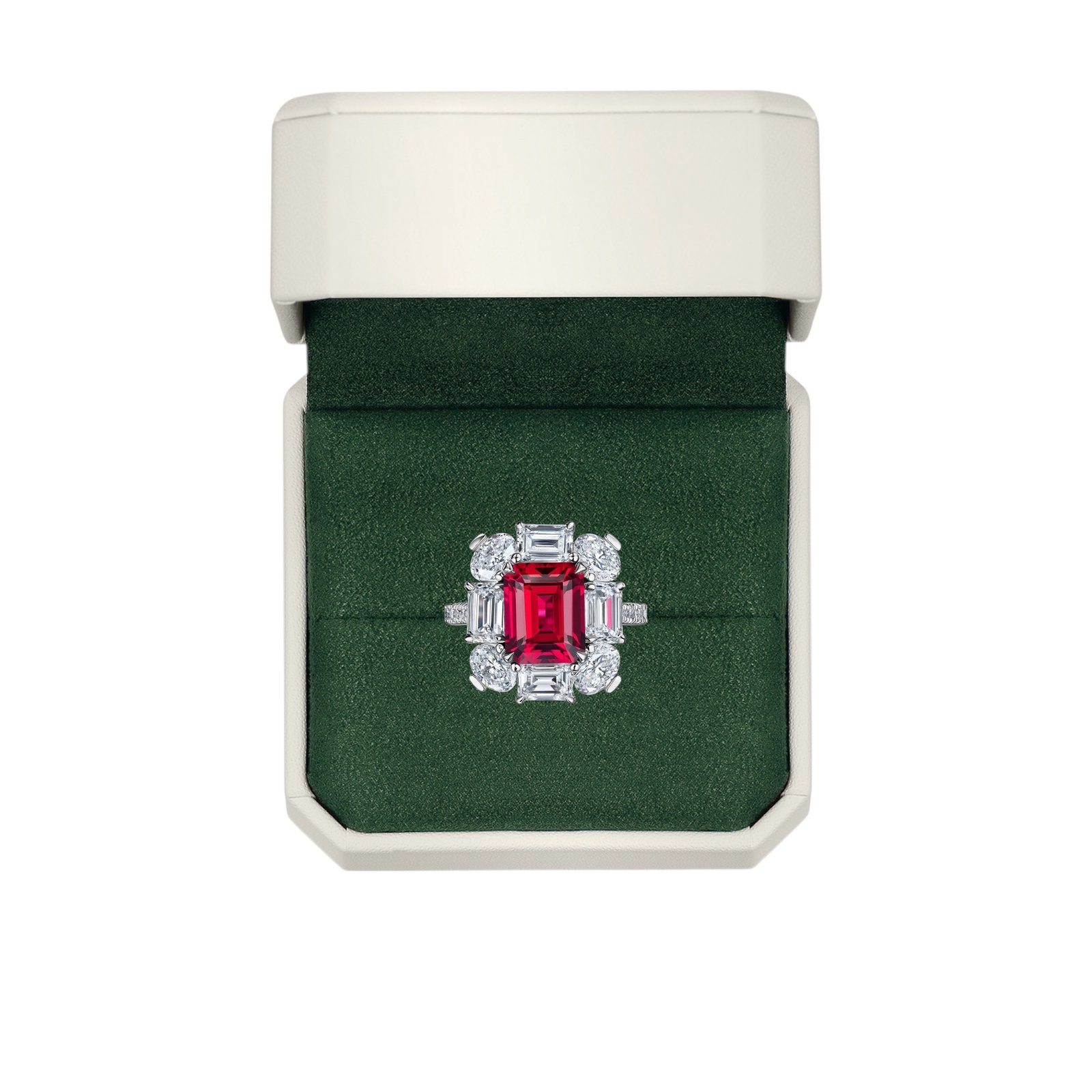 A commanding 6 carats lab-grown ruby captivates with its deep, passionate hue, set in a refined gallery that embraces light. Accented by slender diamond pavé or halo detail, the platinum frame enhances its fire without distraction. This ring is a dramatic statement of power, color, and unmistakable elegance.