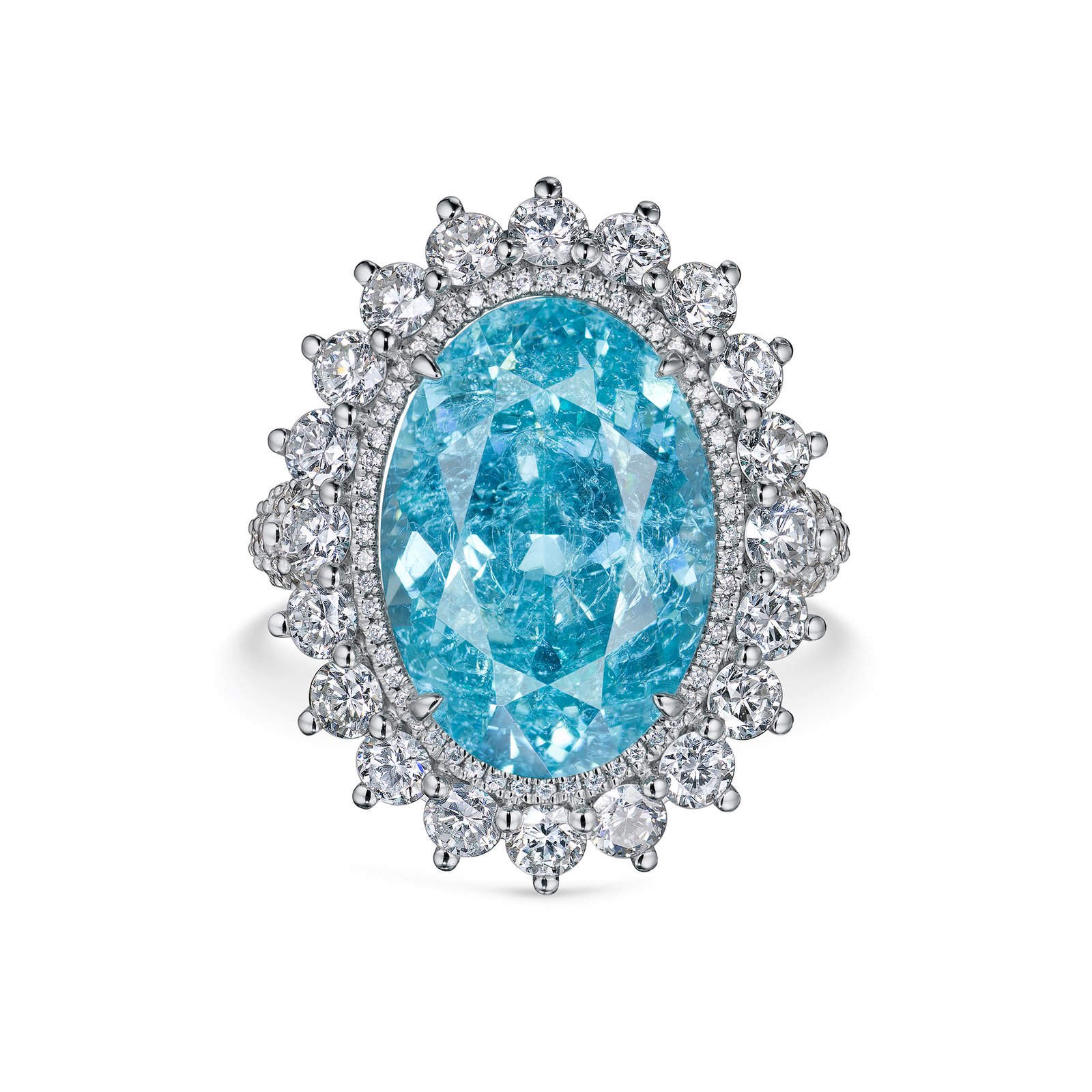 A striking cocktail ring featuring a 23 carats of lab-grown Paraiba Torumaline with a dazzling crashed ice effect, radiating neon brilliance. Beautiful inclusions within the gem create a unique depth and character, reminiscent of ocean currents frozen in time. Set in platinum and surrounded by brilliant lab-grown diamonds, this masterpiece exudes vibrance and artistry.