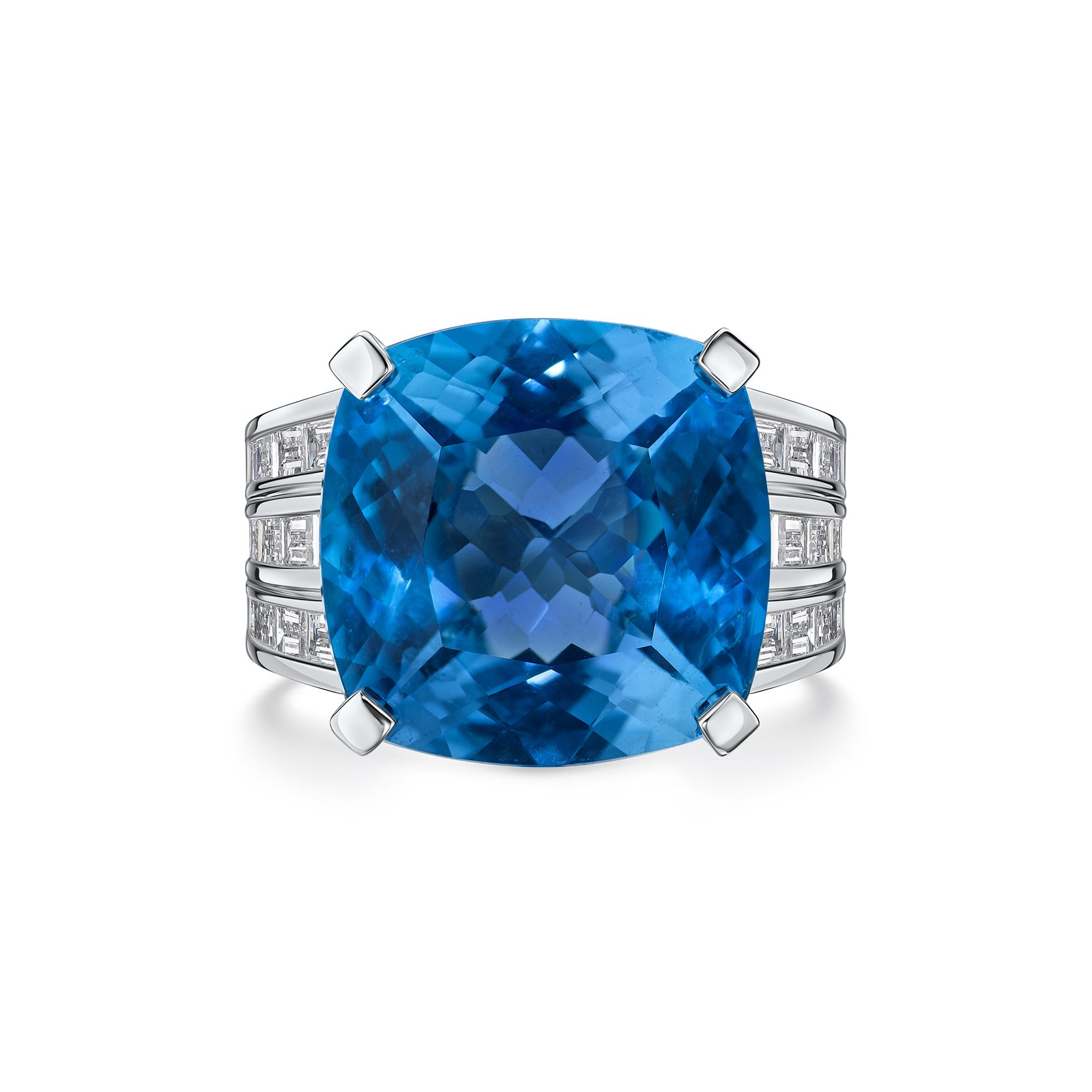 A captivating cocktail ring showcasing a 20.2 carats cushion cut earth-mined swiss blue topaz, glowing with vivid ocean-blue brilliance. Framed by sleek baguette cut lag-grown diamonds, the design is set in platinum with a bold wide shank. A radiant statement piece that embodies strength, color, and refinement.