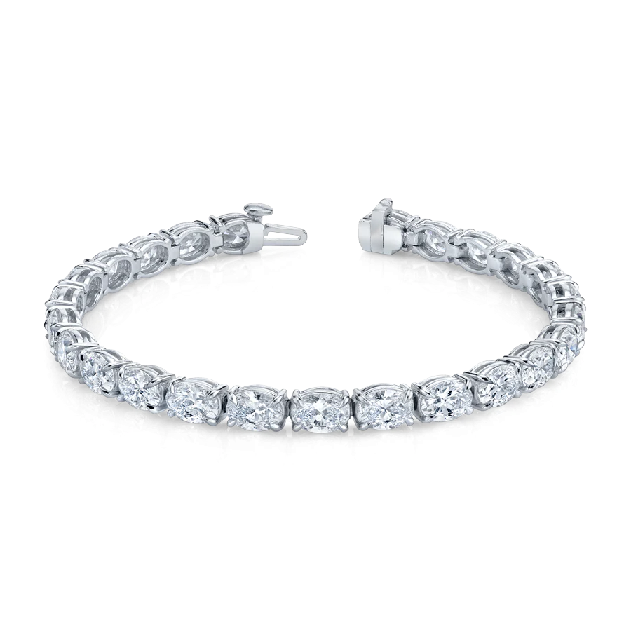 The East West Oval Tennis Diamond Bracelet, featuring over 15 carats of stunning lab-grown diamonds, is set in luxurious platinum. Its refined design and exquisite sparkle make it the ultimate statement piece, perfect for those seeking unparalleled elegance and timeless beauty.