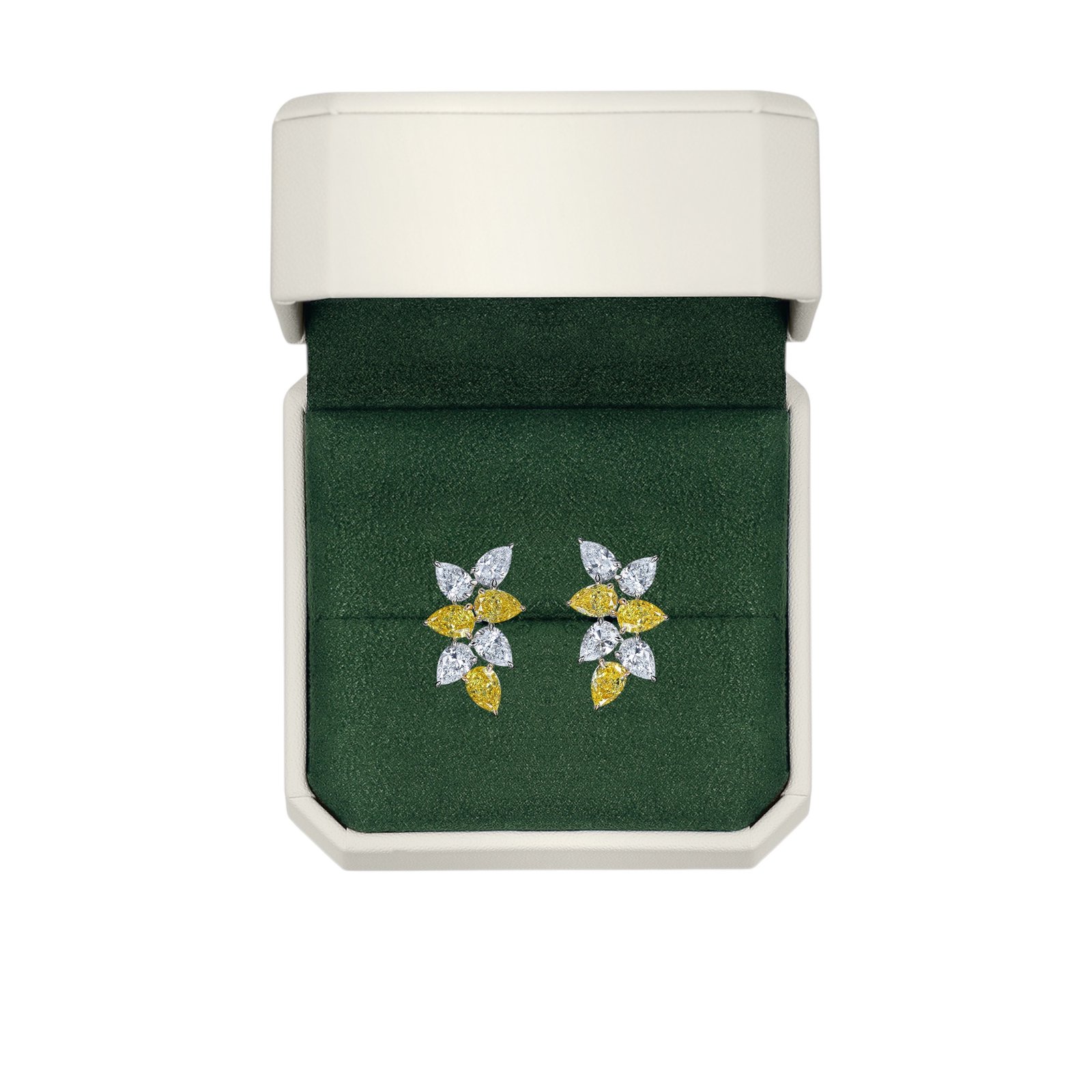 Delicate stud earrings featuring 5.6 carats pear cut lab-grown diamonds in a graceful floral motif. Crafted in white and yellow 18k gold, the design blends vibrant yellow and colorless diamonds for a luminous contrast. A radiant expression of nature’s beauty and refined craftsmanship.