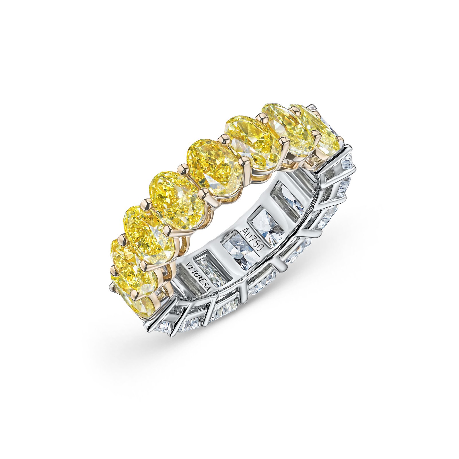 A modern eternity band showcasing 6.4 carats lab-grown diamonds, artfully arranged in alternating oval and radiant cuts. The brilliance of white and fancy yellow stones is set in a striking two-tone design of 18k white and yellow gold. Bold yet refined, this piece is a celebration of color, contrast, and timeless elegance.