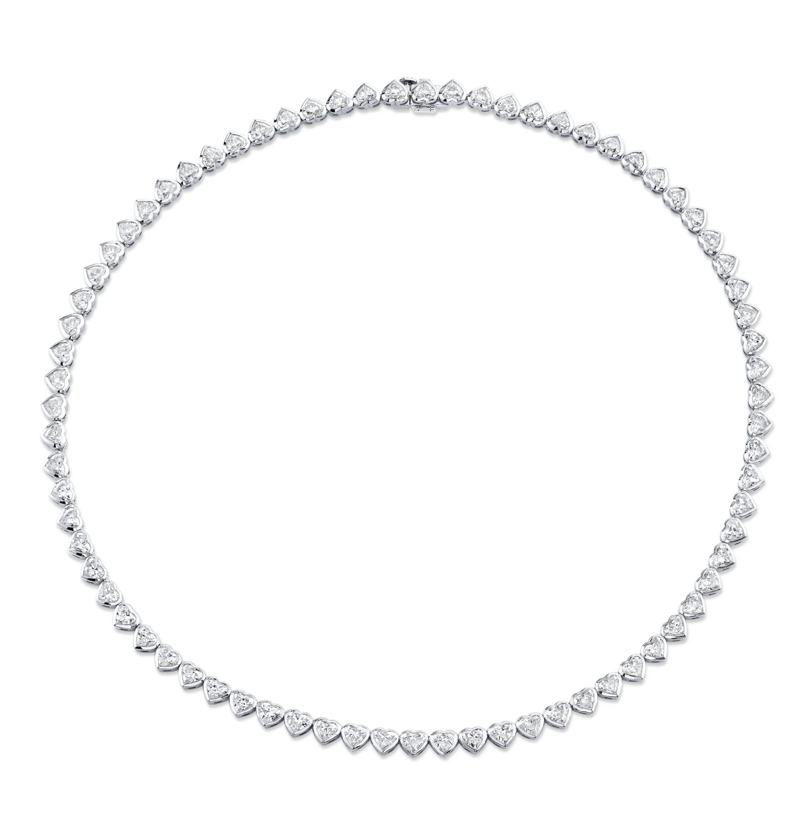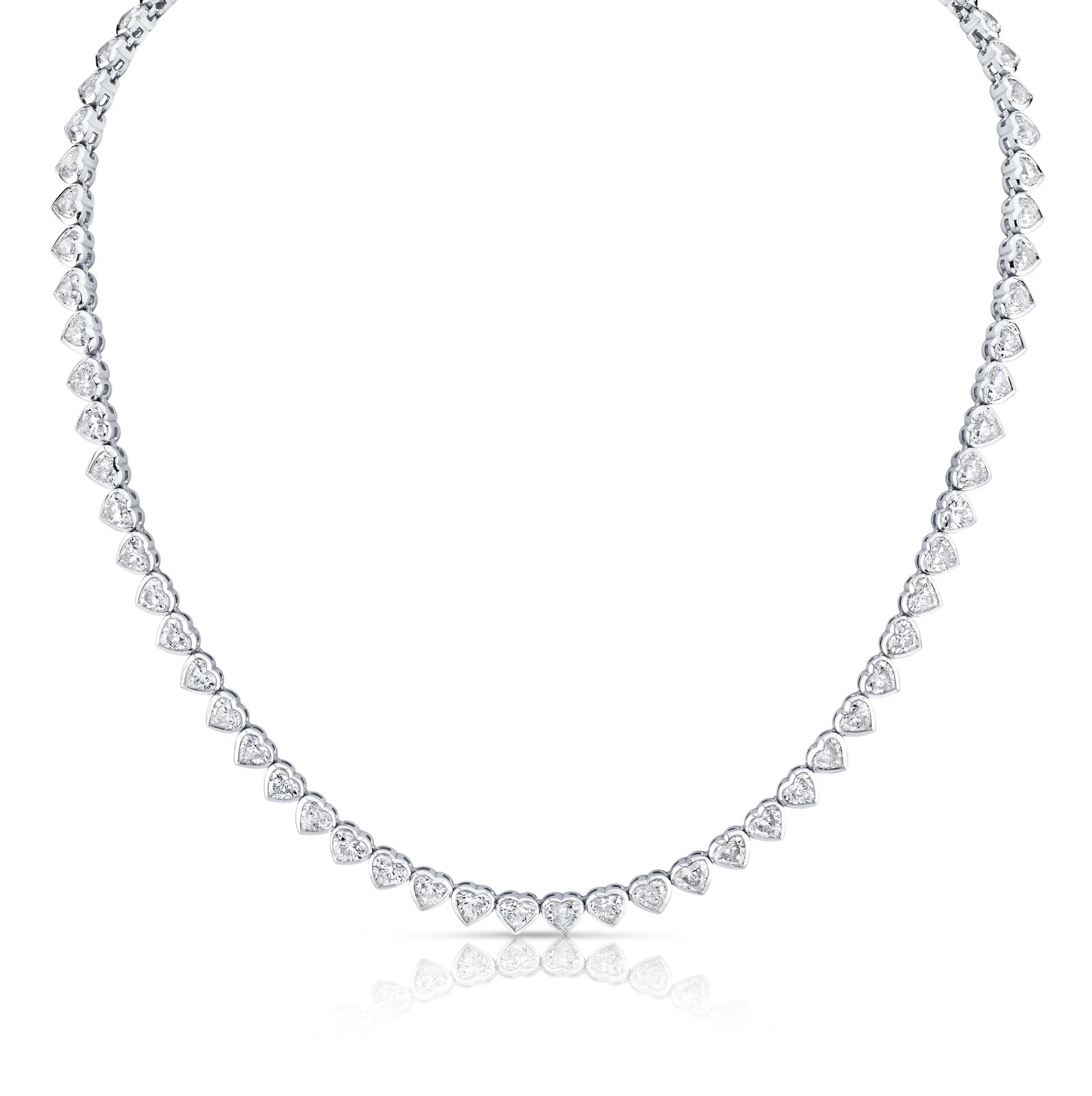 The Tennis Heart-Shaped Diamond Bezel Necklace is expertly crafted with premium 18k gold for lasting strength and brilliant luster. Featuring almost 19 carats of stunning lab-grown diamonds, this elegant piece is available in various metal weights, making it the perfect choice for a luxurious and timeless addition to your collection.